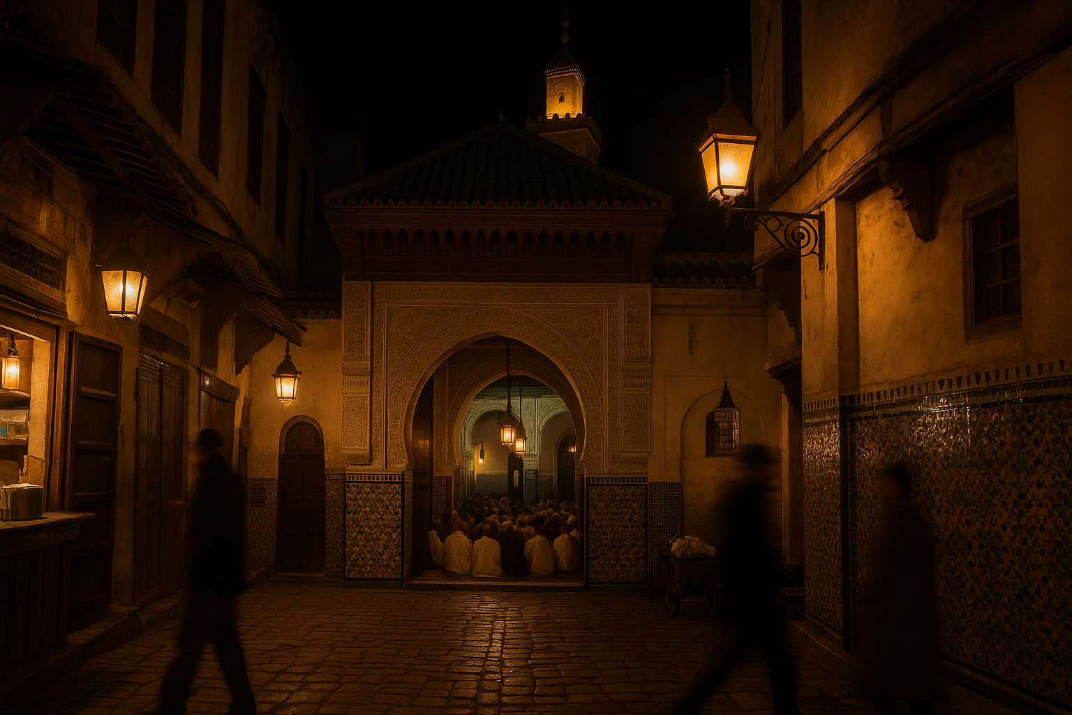 في المغرب تبدأ الحكاية من جبل العلم؛ هناك يلوح عبد السلام بن مشيش (ت 622هـ/1225م) شيخُ التوحيد الموجَز وميزان الصحبة الذي حمله تلميذه أبو الحسن الشاذلي إلى المشرق، فصار مقام ابن مشيش ميزان ابتداءٍ للنية قبل انتظام الحلقة، ومعه تتحدد لهجة الذكر المغربية على يدٍ تُحكم الظاهر وتُصفّي الباطن. هذا الخيط يتصل بمحمد بن سليمان الجزولي (ت 870هـ/1465م) الذي حوّل «دلائل الخيرات» إلى برنامج يومي مديني يمر من الأسواق والكتاتيب إلى البيوت، فصار الذكر قابلاً للإيواء في كل حارة، وتولّد عن ذلك انتظام وقفيّ يضمن قراءة الورد والتعليم معًا. وإلى جوار المدرسة الجزولية يبرز سيدي أحمد أو موسى (ت 970هـ/1563م) في تازروالت جنوبًا، حيث تجتمع الزاوية والضيافة وتنظيم الموسم على نحوٍ يفتح الأسواق ويُثبّت عمران القرى حول خدمة الذكر، في مثالٍ مبكر على اقتران الروح بالاقتصاد المحلي. على هذا الأساس يغدو المغرب مختبر «مدينة الذكر»: زاويةٌ هي سجلُّ وقفٍ ومطبخُ ضيافةٍ وكتابُ صغار ومجلسُ وردٍ وإنشاد، تضبطها شرعية الفقه المالكي وتقاليد القراءة الجماعية، وتقاوم خطر «اعتياد الورد» بالصحبة والمساءلة.