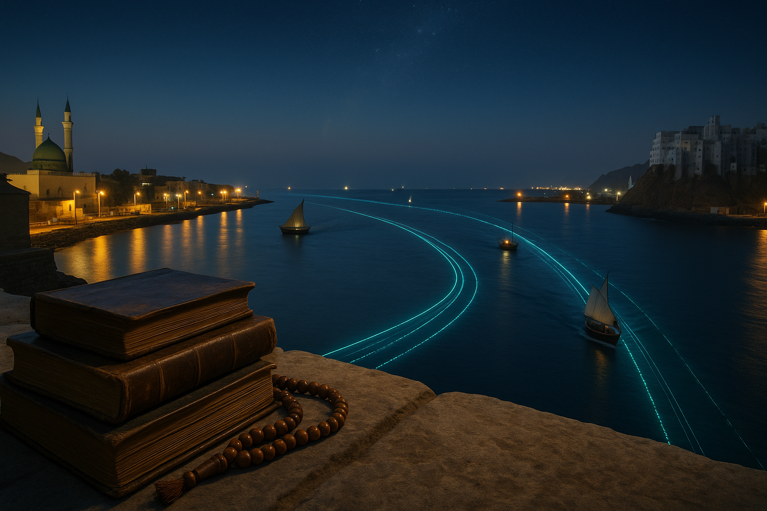 وفي حضرموت تشكّل «طريقٌ يسافر» صاغته مدرسة آل باعلوي: تهذيبٌ يوميّ يجعل الهجرة جزءًا من التربية، ووردٌ ثابت، وصحبةٌ مأمونة، وتعليمُ فقهٍ وحديثٍ يضبط الذوق، وخدمةٌ للفقراء وأبناء السبيل تموّلها الأوقاف. تتجلى ملامحُ المنهج عند عبد الله بن علوي الحداد (1044–1132هـ/1634–1720م) الذي رتّب الأوراد وكتب في آداب السلوك فجعل «الراتب» لسانًا يوميًا للبيوت والزوايا؛ ومن رجالات السلسلة الذين سبقوه أبو بكر بن سالم (919–992هـ/1513–1584م) الذي وحّد الورد والخدمة في بلدان الوادي، وأحمد بن زين الحبشي (1099–1145هـ/1688–1732م) الذي شدّد على صحبة العلم وتخفيف الاصطلاح مع إحكام الاتباع. وإلى جوارهم لمع رجالُ دعوةٍ وسندٍ من آل العيدروس، تشكّلت منهم «العيدروسية» بلسان المحبة وخدمة الناس، فكانت لهم صِلاتٌ بمكة والمدينة وعدن وحضرموت، وانتقل أثرهم مع المهاجرين إلى سواحل الهند وشرق إفريقيا وجنوب شرق آسيا. بهذه الصيغة خرج «المهاجر» حاملَ طريقٍ من عدن والمكلا ومسقط إلى زنجبار وسورابايا وسنغافورة؛ زاويةٌ هي دفترُ وقفٍ ومجلسُ علمٍ ومطبخُ ضيافةٍ في آن. وحين التقت خيوط الحرمين وحضرموت على طرق البر والبحر، بدا الأثر الممتدّ واضحًا: الشاذلية والقادرية والإدريسية تتبادل السند في مكة والمدينة، والمدرسة العلوية تُوزّع الذكر عبر المرافئ، فتتولّد صيغٌ ستظهر آثارها لاحقًا في مصر والمغرب والسودان والهند.
